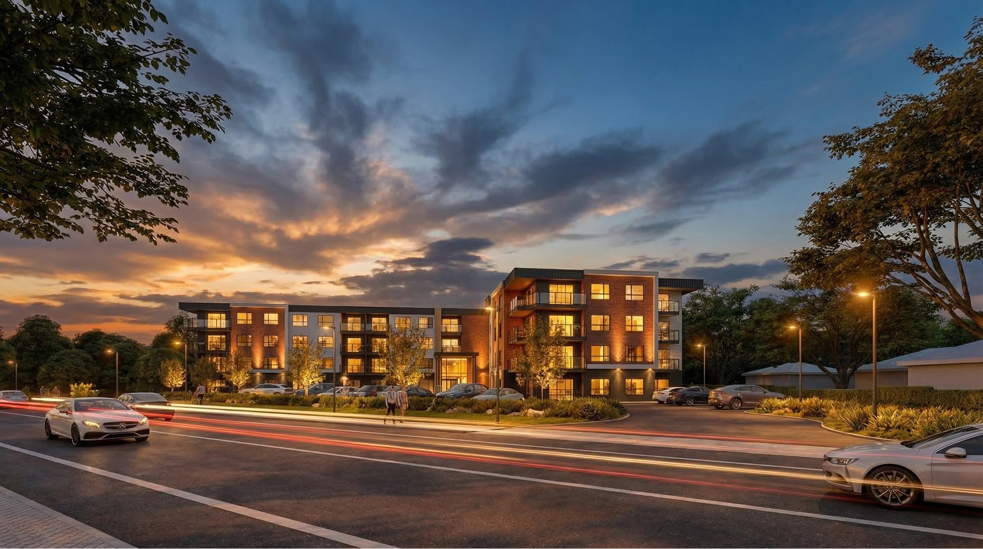 Located along Ospika Boulevard in Prince George, this luxury senior living apartment complex stands five storeys high with a spacious underground parkade and thoughtfully designed amenity spaces to support independent living. The building celebrates contemporary residential design with a distinctive exterior façade featuring geometric EIFS stucco patterns, heavy timber accents, and natural brick detailing that complement the surrounding site and create a welcoming arrival sequence.