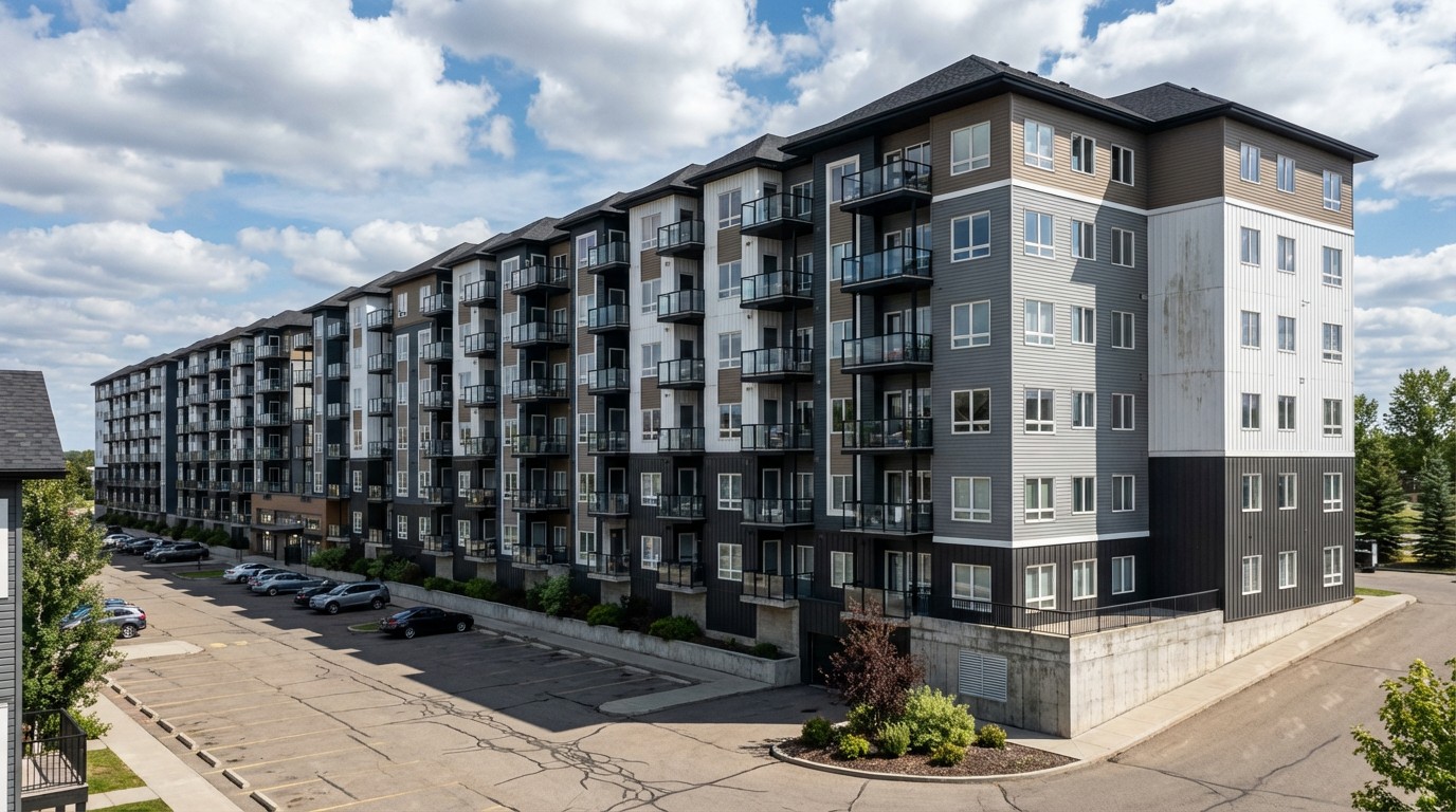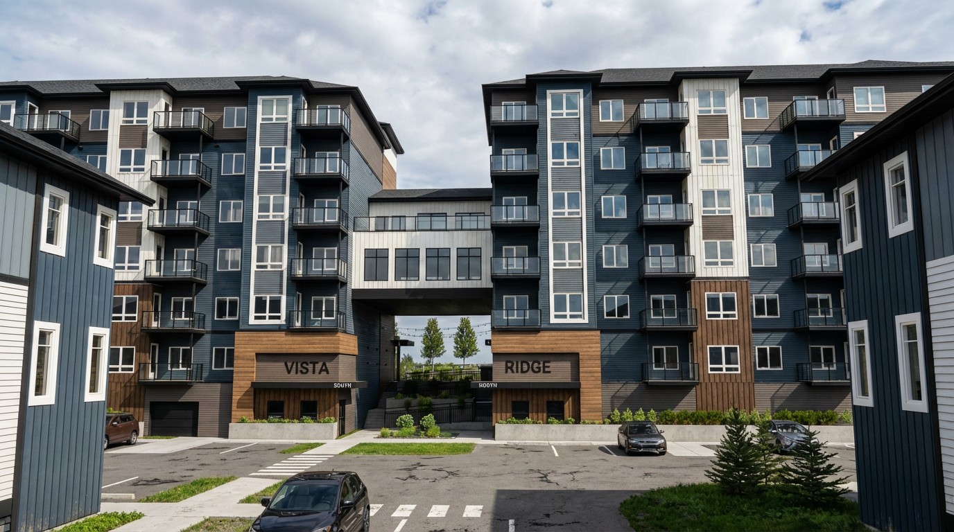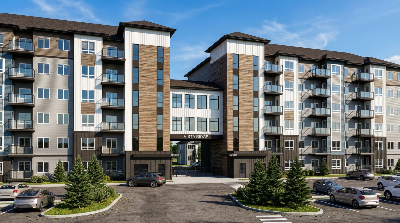 The Vista Ridge project involves constructing a six-storey apartment building with 262 dwelling units, divided into north and south blocks, built atop an existing parkade.